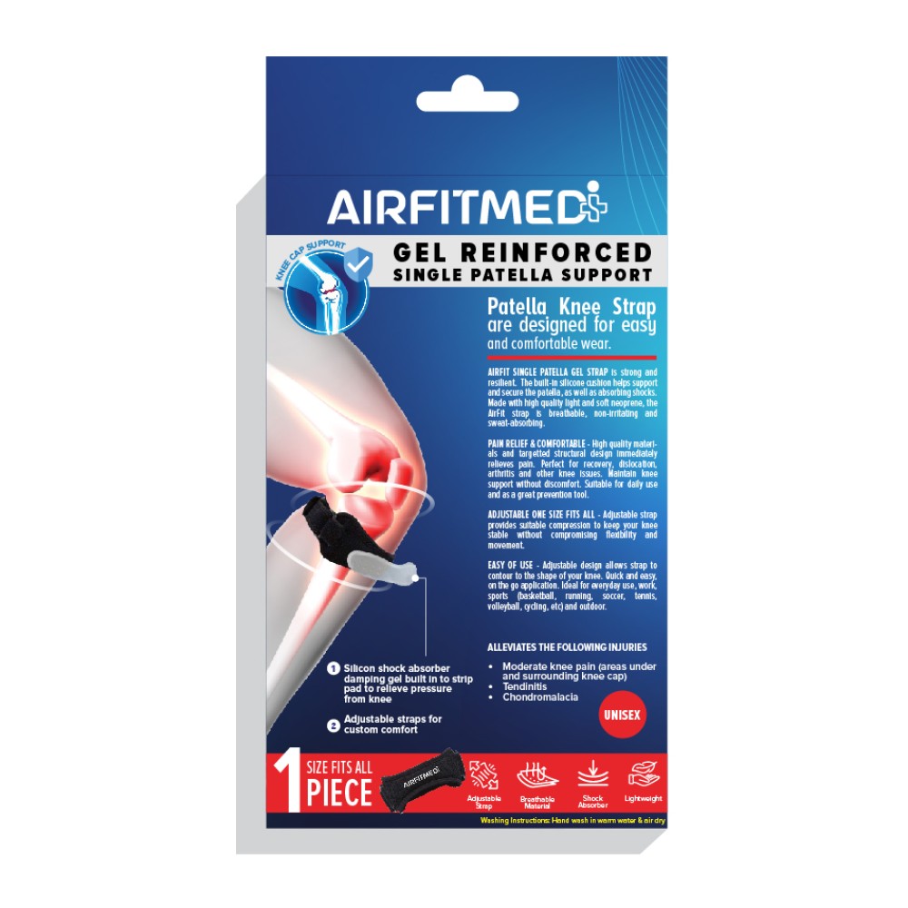 SINGLE PATELLA GEL STRAP is strong and resilient. The built-in silicone cushion helps support and secure the patella, as well as absorbing shocks. Made with high quality light and soft neoprene, the AirFit strap is breathable, non-irritating and sweat-absorbing.