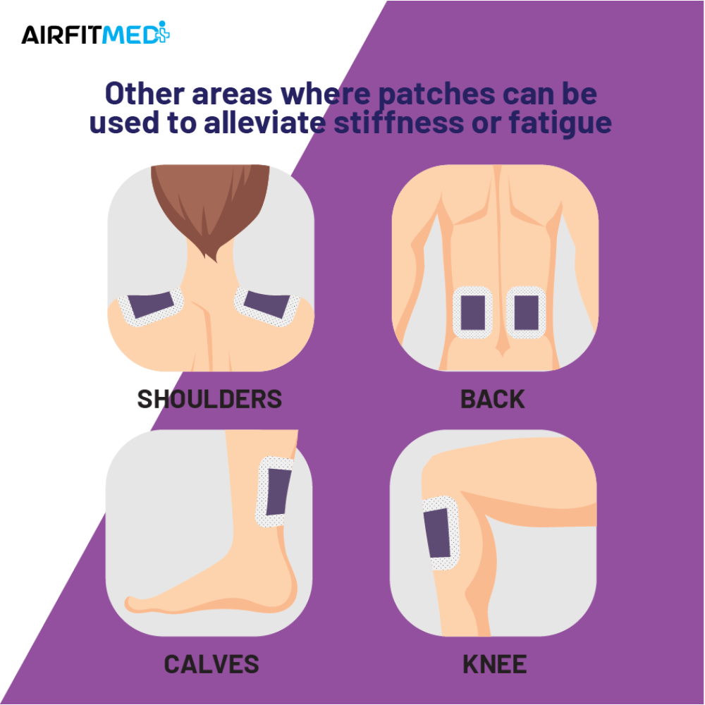Other areas where patches can be used to alleviate stiffness or fatigue: Shoulder, Back, Calves & Knee