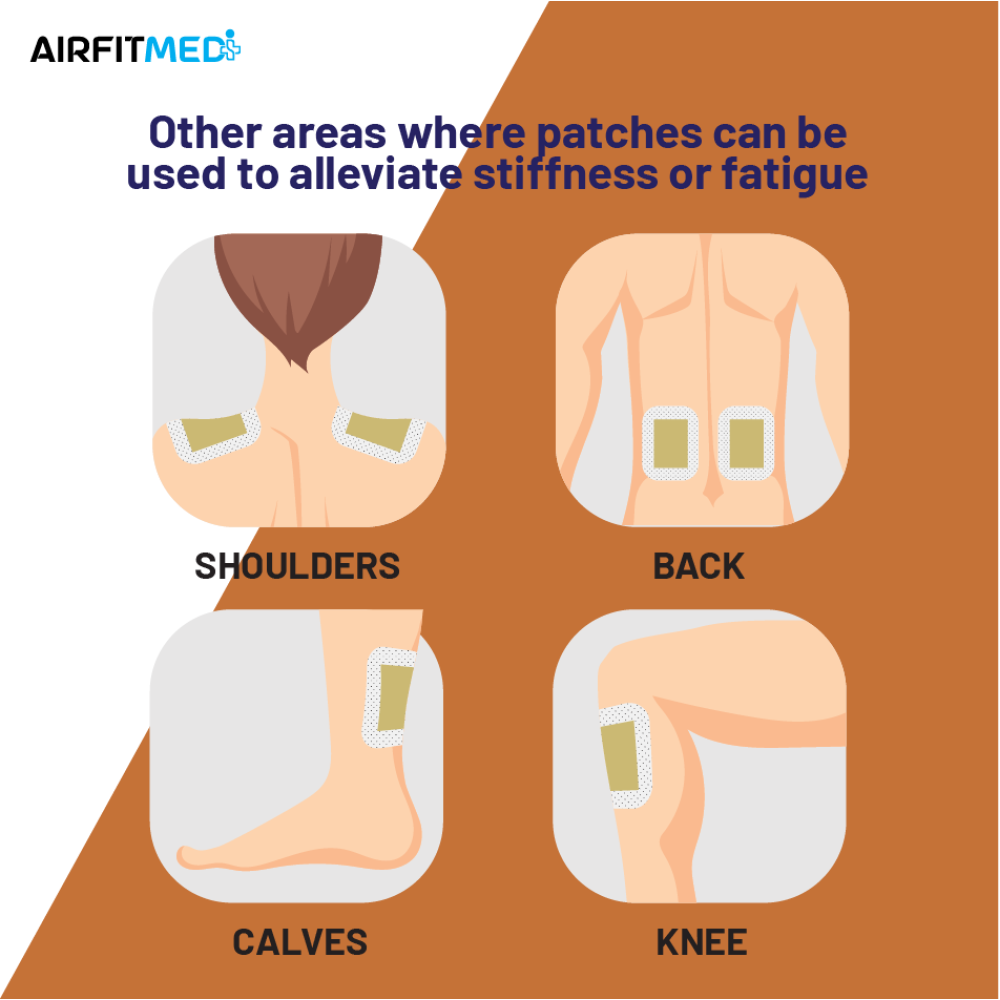 Other areas where patches can be used to alleviate stiffness or fatigue: Shoulder, Back, Calves & Knee