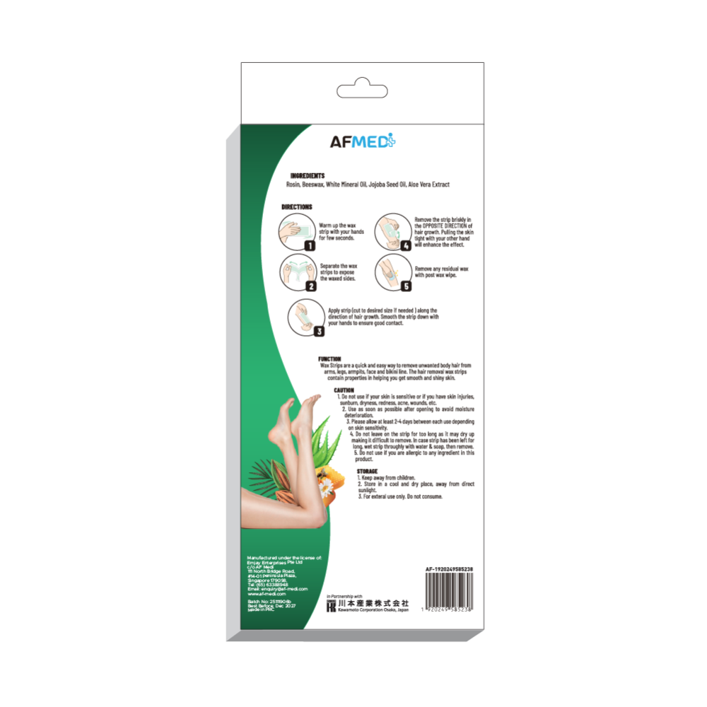AirFit Medi Wax Strips are a quick and easy way to remove unwanted body hair from arms, legs, armpits, face and bikini line. The hair removal wax strips contain properties in helping you get smooth and shiny skin.
