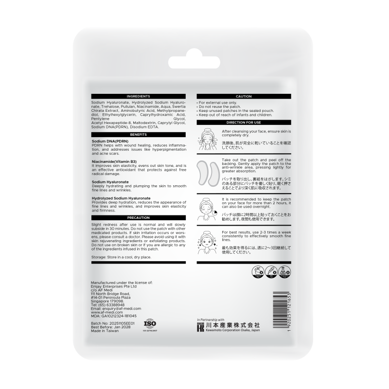 Slight redness after use is normal and will slowly subside in 30 minutes. Do not use the patch with other medicated products. If skin irritation occurs or worsens, please consult a doctor. Please avoid using it with skin rejuvenating ingredients or exfoliating products. Do not use on broken skin or if you are allergic to any of the ingredients infused in this patch.