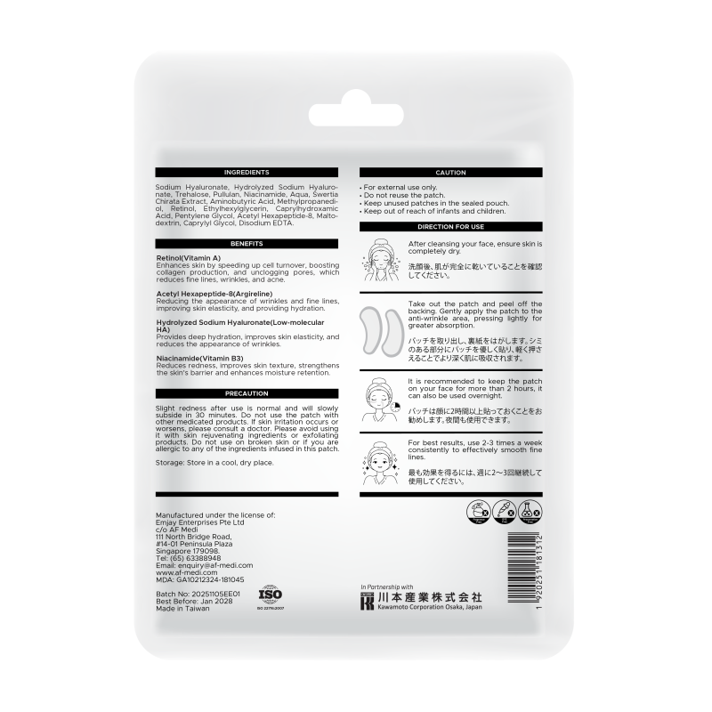 Slight redness after use is normal and will slowly subside in 30 minutes. Do not use the patch with other medicated products. If skin irritation occurs or worsens, please consult a doctor. Please avoid using it with skin rejuvenating ingredients or exfoliating products. Do not use on broken skin or if you are allergic to any of the ingredients infused in this patch.